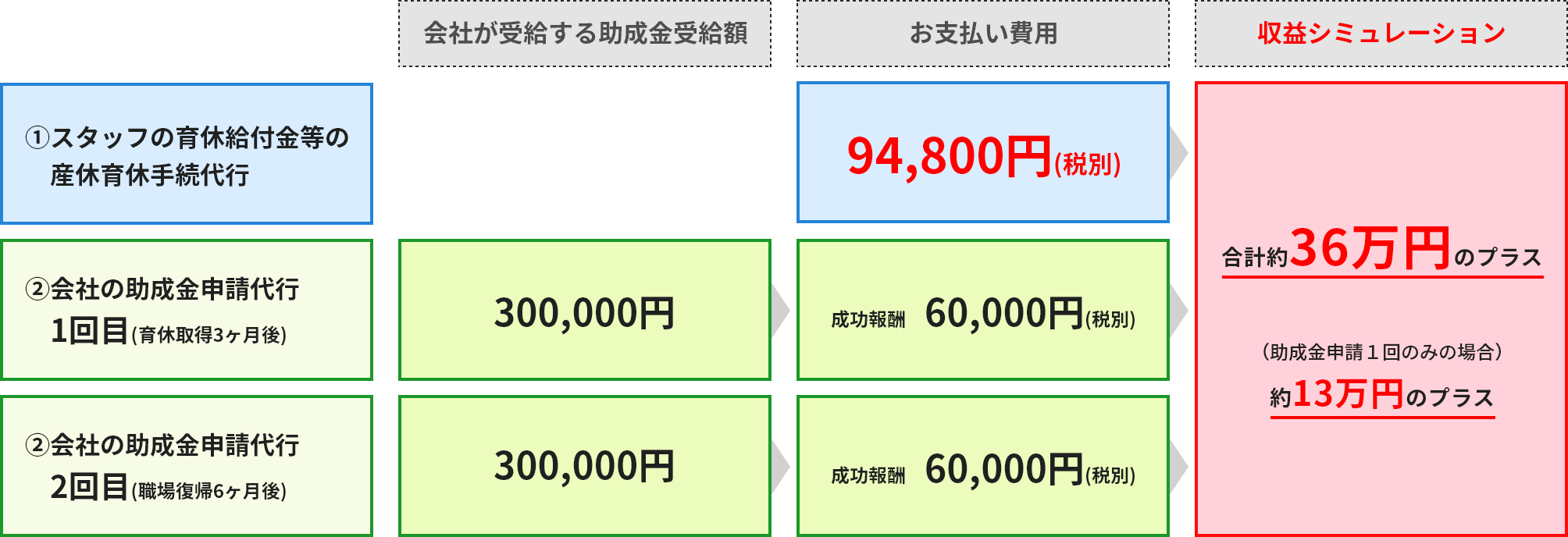 ✓②の助成金申請のみのサポートは、原則お請けしておりません(①の育休給付金等の手続とセットが原則)。