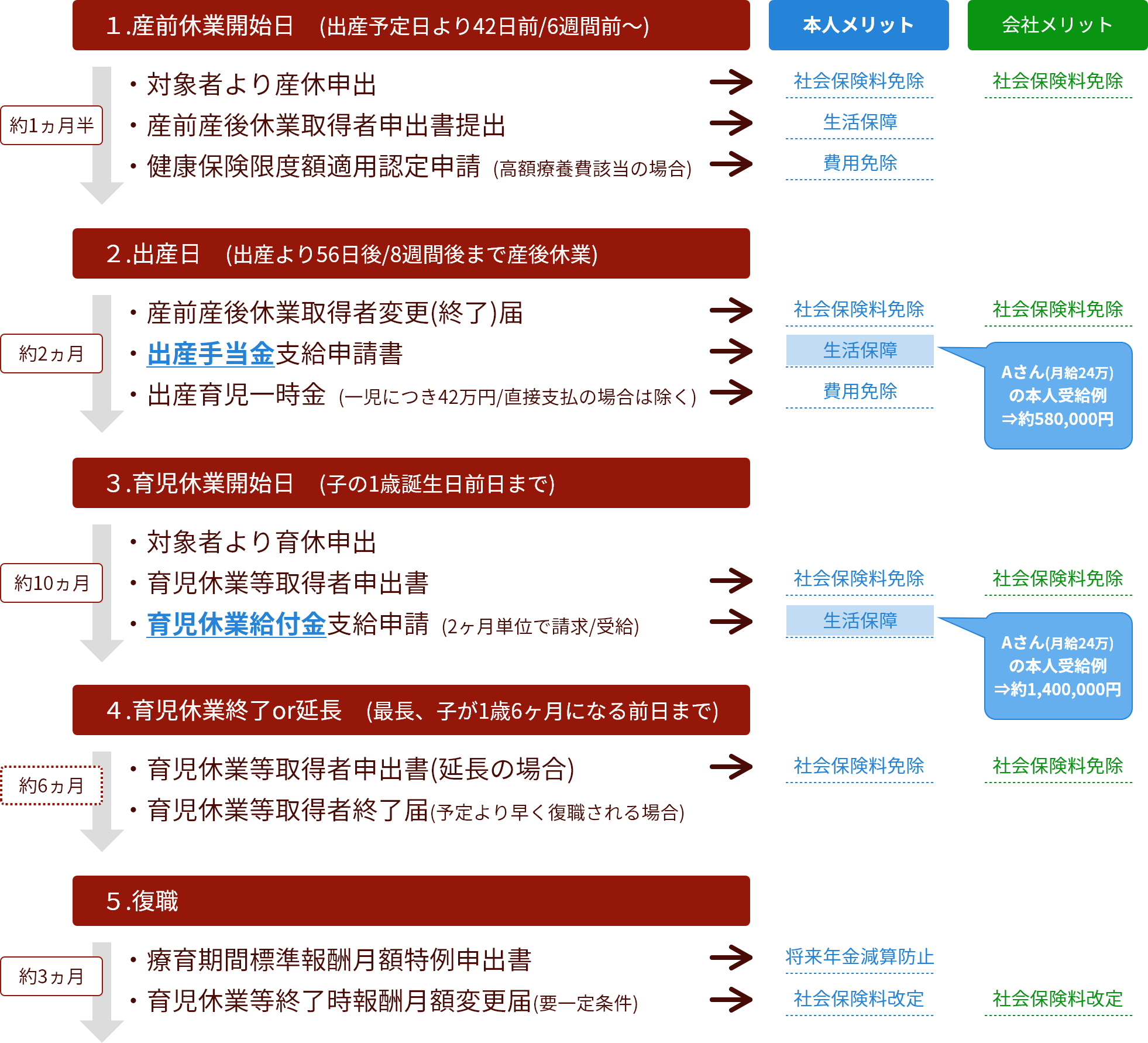 出産・育休後、職場復帰までされる場合は、手続きが1年半から2年に亘って必要となる場合があります。当方では。1案件につき、職場復帰後の手続きが完了するまでをサポート範囲としていますので、手続き期間により追加で費用が発生することはございません。